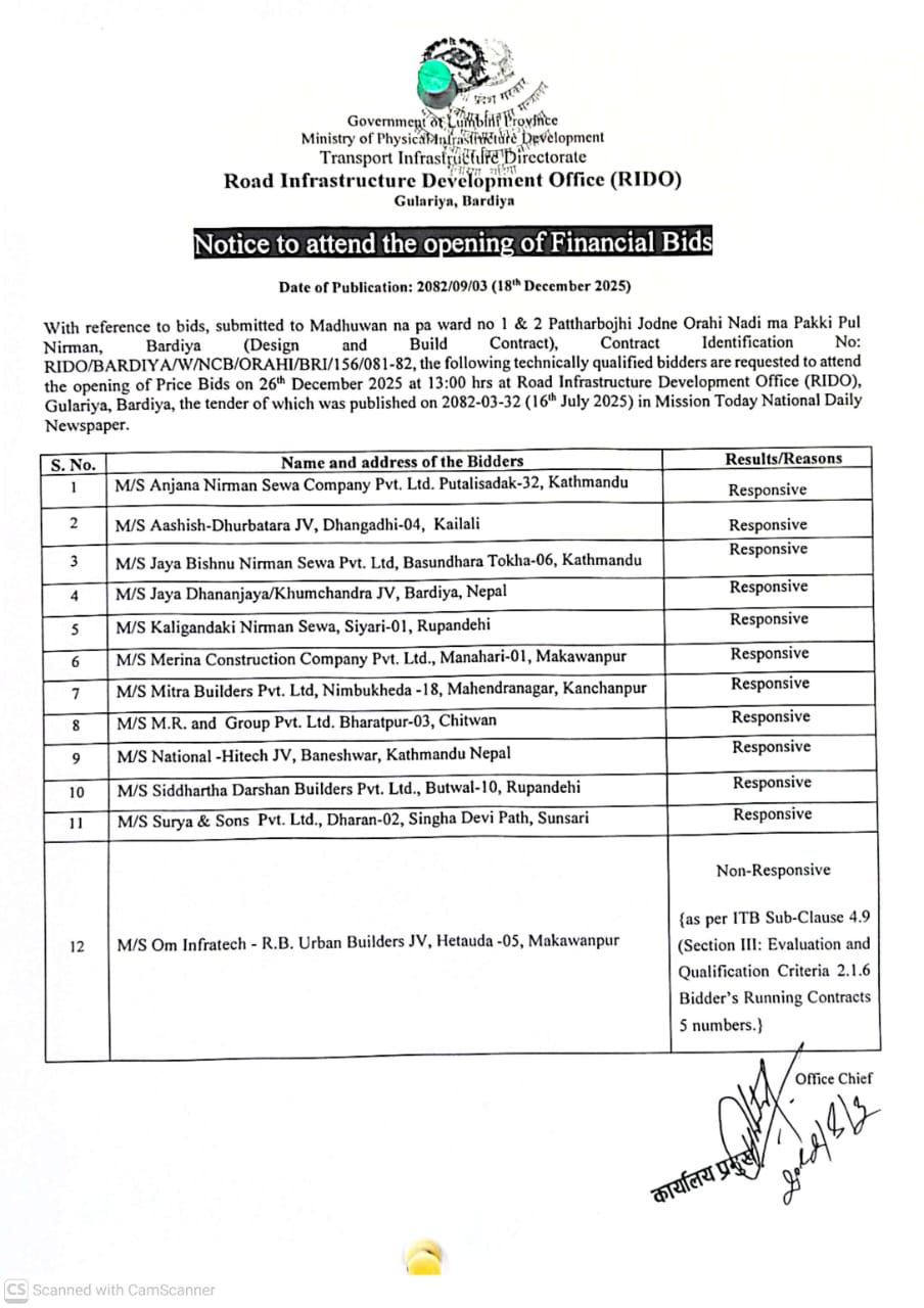 प्रदेश सरकार, लुम्बिनी प्रदेशको २०७६ सालको निर्णय बमोजिम मिति २०७६ साल माघ ०१ गते बर्दिया जिल्लामा विधिवत रुपमा "सडक पूर्वाधार विकास कार्यालय" स्थापना भई संचालनमा आएको हो । यस बर्दिया जिल्ला भित्र रहेका लुम्बिनी प्रदेश सरकार भौतिक पूर्वाधार बिकास मन्त्रालय, यातायात पूर्वाधार निर्देशनालयको नीति र निर्देशन बमोजिम प्रादेशिक सडक, सडक पूल तथा झोलुङ्गे पूलहरुको निर्माण तथा मर्मत गर्नु यस कार्यालयको... थप हेर्नुहोस